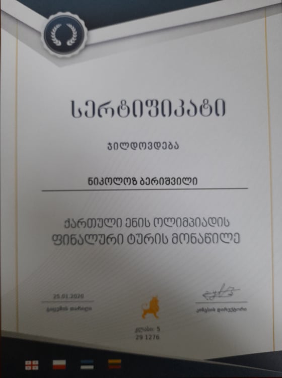 7. ნიკოლოზ ბერიშვილი (VI კლასი, ქართული ენა, მასწავლებელი - ქეთო გაგუა);