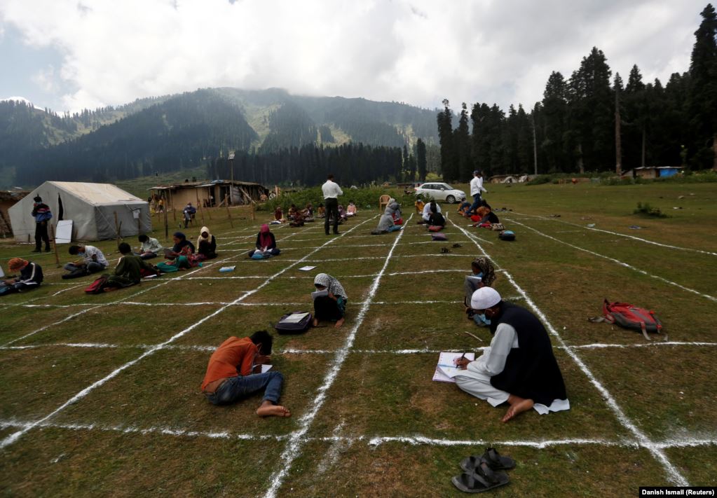 ავღანელი მოსწავლეები გაკვეთილზე ქალაქ ჰერათში. ავღანეთში სკოლები 22 აგვისტოს გაიხსნა, მოსწავლეებს პირბადის ტარების ვალდებულება აქვთ. საკლასო ოთახებში ჩვეულზე ორჯერ ნაკლები ადამიანია. გაკვეთილები კი ორ ცვლაში მიმდინარეობს.