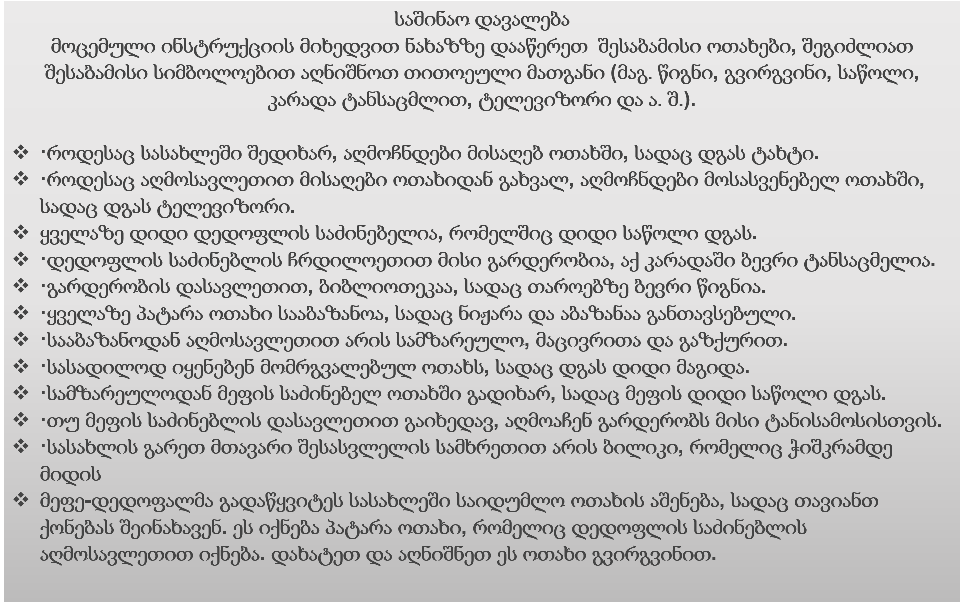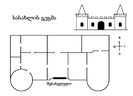 საშინაო დავალებისათვის კი დავურიგე წინასწარ მომზადებული სამეფო სასახლის გეგმა (ნახაზი) და ტექსტი, სადაც განმარტებული იყო ოთახების მდებარეობა, მათ უნდა გამოეცნოთ ეს ოთახები და სიმბოლურად ჩახეტათ შიგნით საგნები (მაგ. წიგნები, ტელევიზორი, მაგიდა და ა.შ. ) დავალება ვანახე ასევე სლაიდებზეც. ეს დავალება სახალისო შესასრულებელია, შედეგად კი მოსწავლეებს ეცოდინებათ ჰორიზონტის ძირითადი მხარეები, შეეძლებათ ჰორიზონტის მხარეების ცოდნის პრაქტიკული გამოყენება.დავალებას კი შევუფასბა კრიტერიუმით – რამდენად აკურატულად შეასრულა მოსწავლემ ის, რამდენად სუფთად და ზუსტად არის დატანილი სიმბოლოები, არის თუ არა შეცდომები.