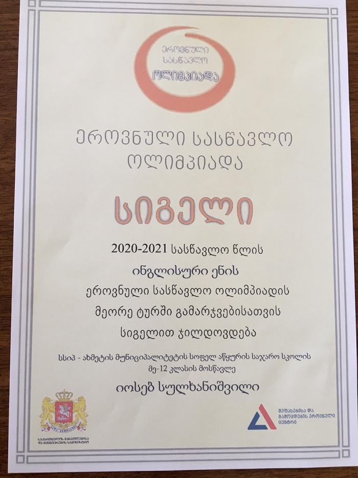 2020-2021 სასწავლო წლის ინგლისური ენის ეროვნული სასწავლო ოლიმპიადის მეორე ტურში გამარჯვებისათვის კურსდამთავრებულები ქრისტინე მახატლიშვილი და იოსებ სულხანიშვილი სიგელებით დაჯილდოვდნენ.