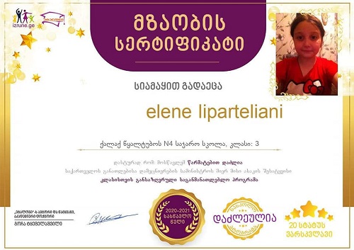 ელენე ლიპარტელიანი აქტიურად არის ჩართული მოსწავლეთა ტესტირების ინოვაციურ პორტალში - izrune.ge, სადაც ხშირად ჯილდოვდება სხვადასხვა სიგელებით.
