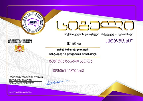 ინტელექტ-ჩემპიონატში მონაწილე ყველა ხონელი მოსწავლე „ეტალონის“ სპეციალური ონლაინ სიგელით დაჯილდოვდა.