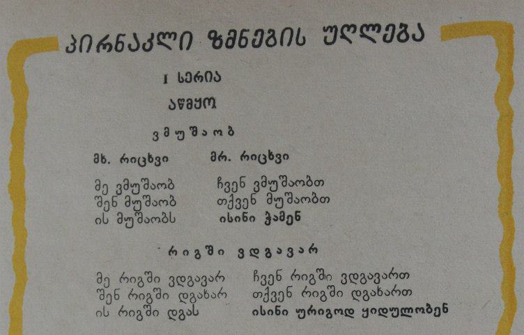 საქართველოს ეროვნული არქივი იუმორისტული ჟურნალ „ნიანგის“ ფოტოს აქვეყნებს, სადაც პირნაკლი ზმნების უღლებაა მოცემული
