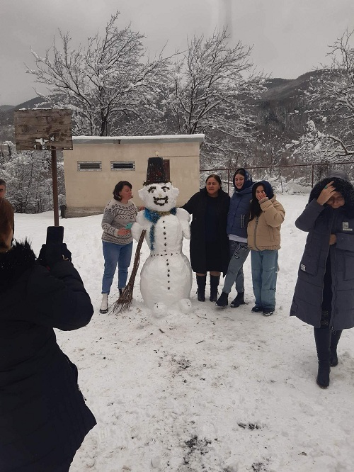 სკოლის ეზოში ბავშვებმა მასწავლებელთან ერთად იგუნდავეს, თოვლის ბაბუა გააკეთეს და დრო ხალისიანად გაატარეს.