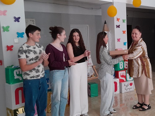 ქუთაისის N16 საჯარო სკოლის X კლასის მოსწავლეები - ბარბარე გიგაშვილი, ნია ბენდელიანი, ანანო ხურციძე და შალვა ლიკლიკაძე საბაზო საფეხურის წარჩინებით დამთავრებისთვის კომპიუტერები გადაეცათ.